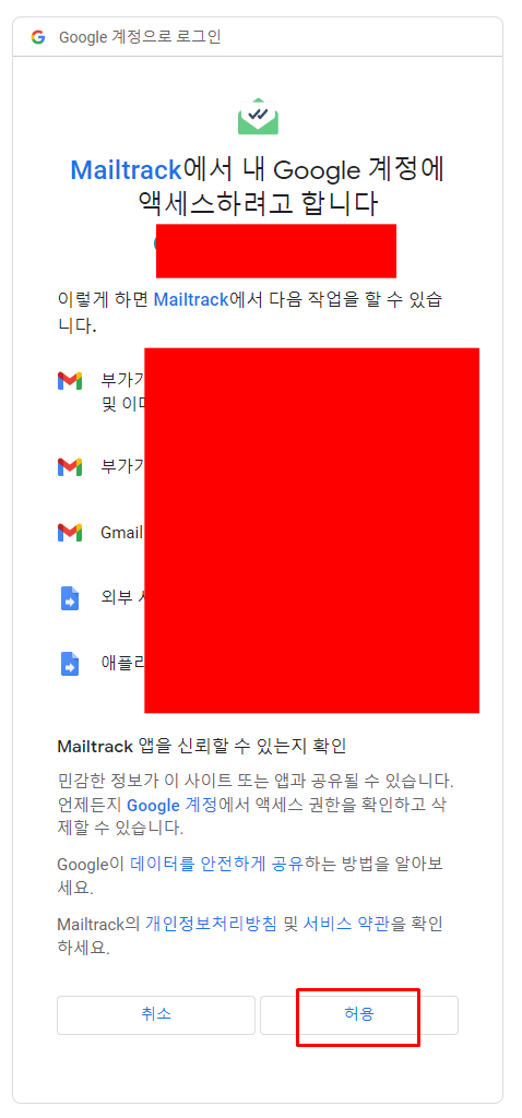 8. 'Mailtrack에서 내 Google 계정에 액세스하려고 합니다.' 부분에서 [허용] 버튼을 선택합니다.