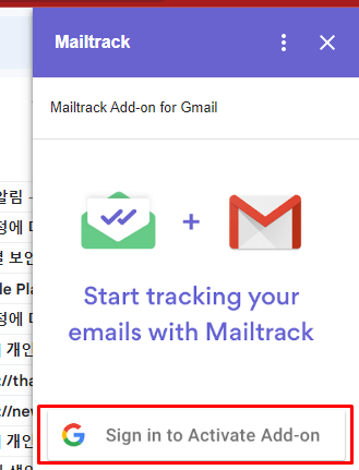 오른쪽에 정렬되어 있는 아이콘들 중 mailtrack에 관련된 아이콘을 선택합니다. 그럼 Sign in to Activate Add-on이라는 버튼이 오른쪽에서 창으로 나타나는데요. 이 과정을 마무리 해야만 합니다. 클릭합니다.